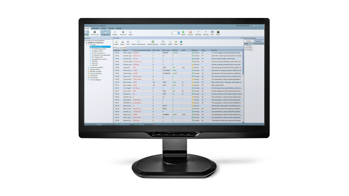 Oprócz programowania, uzyskasz dostęp również do wiadomości diagnostycznych napędu, a także oscyloskopu, na którym wyświetlisz wykres interesujących Cię zmiennych.