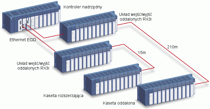 W systemach sterowania gdzie wymagana jest obsługa większej ilości sygnałów I/O do rozbudowy można wykorzystać lokalne lub oddalone kasety rozszerzeń. Do pojedynczego kontrolera PACSystems RX3i można dołączyć do 8 kaset rozszerzających, które mogą być oddalone nawet o 750 metrów od kasety bazowej.