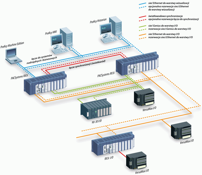 W oparciu o kontrolery PACSystems RX3i, budowane są układy wysokiej dostępności PACSystems HA RX3i wykorzystujące sprzętową synchronizację danych w kontrolerach pracujących w układzie redundancji. Mają one zastosowanie tam, gdzie wymagana jest zwiększona niezawodność i dostępność systemu sterowania czyli między innymi w branży energetycznej, chemicznej, petrochemicznej oraz wod-kan. Rozwiązanie pozwala na budowanie warstwy sterującej, w której podwojone kasety z dedykowanymi do tych celów jednostkami centralnymi, modułami komunikacyjnymi do systemów SCADA i układów wejść/wyjść zapewniają wysoki poziom dostępności, czyniąc system odpornym na pojawiające się awarie. Bezpieczeństwo oraz dostępność układu może być dodatkowo podniesiona poprzez zapewnienie alternatywnych źródeł zasilania kontrolera, co jest możliwe dzięki obsłudze dwóch lub więcej zasilaczy w ramach jednej kasety. W systemach o takiej architekturze do zbierania danych procesowych stosowane są lokalne lub oddalone układy wejść/wyjść oddalonych RX3i I/O, VersaMax I/O, RSTi-EP I/O oraz PAC8000 I/O.