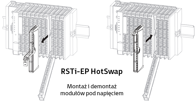 Serwis i wymiana modułów realizowana jest na ruchu dzięki obsłudze funkcji Hot-Swap (wyjmowanie modułów rozszerzeń pod napięciem, bez wpływu na pozostałe elementy). Umożliwia to konstrukcja RSTi-EP, w której każdy moduł osadzony jest na standardowej podstawce. Zadaniem podstawki jest dystrybucja zasilania w układzie oraz zapewnienie komunikacji pomiędzy kolejnymi modułami rozszerzeń a interfejsem komunikacyjnym, pomimo usunięcia modułu sygnałowego.