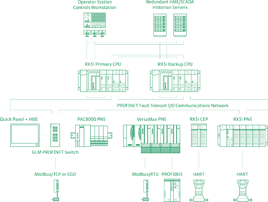 PACSystems RX3i I/O – Skalowalny układ wejść-wyjść rozproszonych do układów redundancji. W oparciu o serię RX3i można zbudować oddalone układy wejść-wyjść, które z systemem nadrzędnym komunikują się w oparciu o redundantną sieć Ethernet 1Gb. Modułowa konstrukcja daje możliwość doboru konfiguracji sygnałów IO w zależności od potrzeb obiektu oraz możliwość realizacji czynności serwisowych bez zatrzymywania jego pracy. Układy wejść/wyjść zbudowane w oparciu o RX3i pozwalają ponadto na obsługę lokalnej logiki w węźle, obsługę lokalnych modułów komunikacyjnych oraz obsługę sygnałów HART.