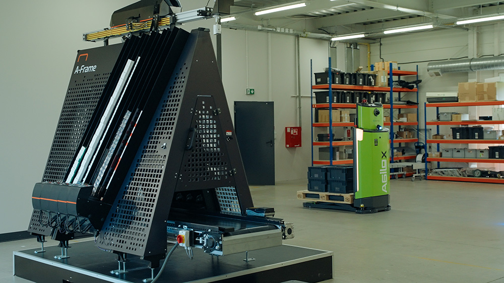 A-Frame to w pełni zautomatyzowane rozwiązanie do kompletacji zamówień, umożliwiające szybkie przetwarzanie złożonych zamówień.