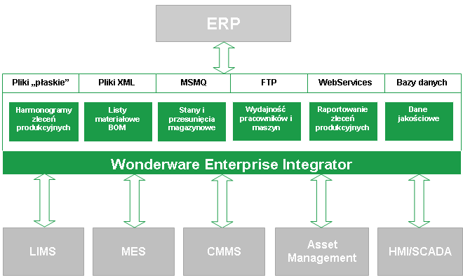 AVEVA (dawniej Wonderware) Enterprise Integrator umożliwia integrację, pochodzących z produkcji, bieżących danych z aplikacjami biznesowymi takimi jak SAP, Oracle s czy J.D Edwards oraz z aplikacjami poziomu zarządzania łańcuchem dostaw takimi jak aplikacje Enterprise Asset Management.